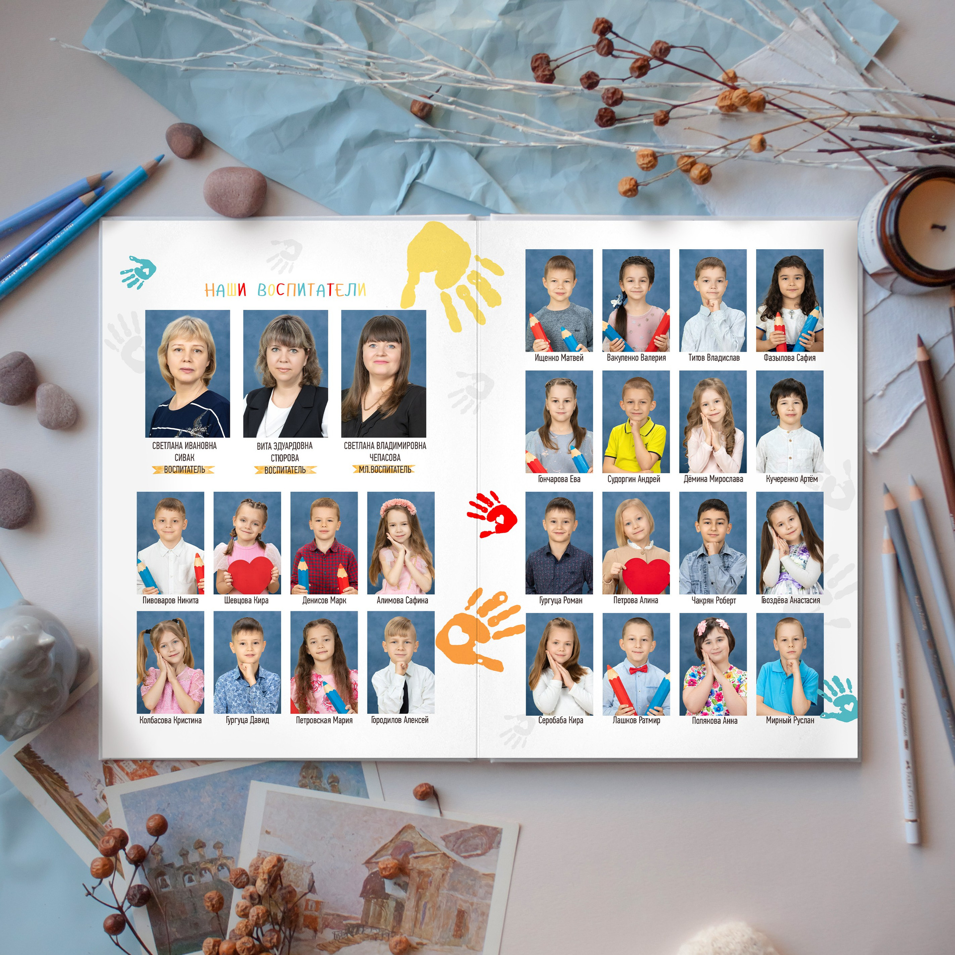 — Первый разворот: Виньетка с портретами всех ребят группы и педагогов с подписанными именами и фамилиями.